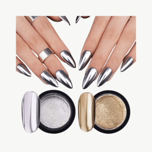 Polvo decorativo para uñas que crea un acabado metálico con reflejo tipo espejo en tonos plateado y dorado. Ideal para lograr un look elegante y brillante en uñas acrílicas, de gel o naturales.