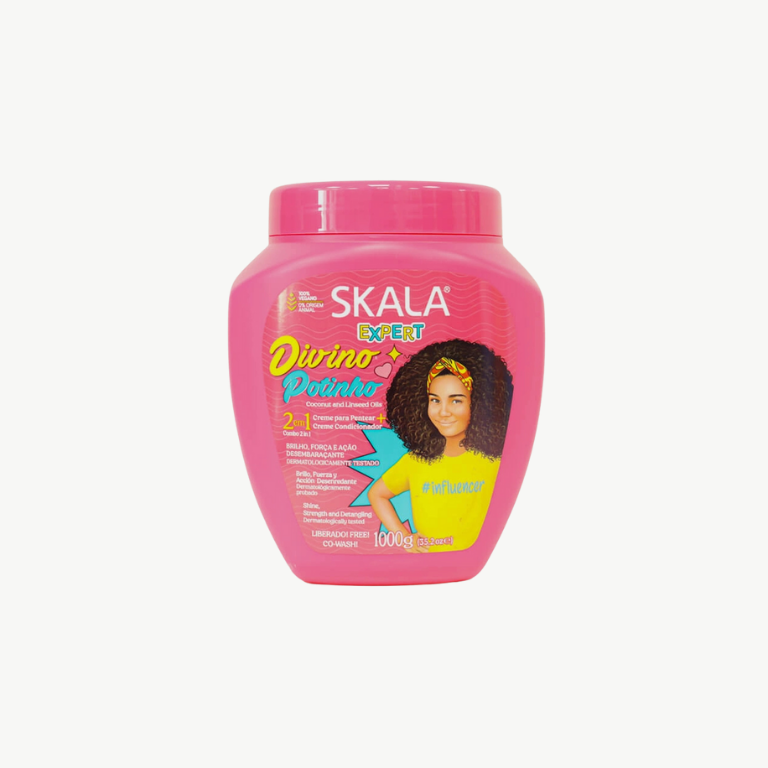La crema para peinar 2 en 1 Divino Potinho de SKALA ayuda a desenredar, hidratar y controlar el frizz de los más pequeños, sin dejar residuos pesados.